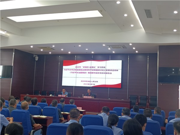 9月7日下午,市委宣讲团成员、党史党建教研室副主任孔华赴贵池区人民法院作专题宣讲。宣讲会上,孔华紧密结合池州近年来发展形势,从理论和实践维度解读了习近平总书记在省部级主要领导干部专题研讨班上的重要讲话精神,并从出版前言解析、一系列原创性的新理念新思想新战略、重大意义、主要精神等方面详细解读了《习近平谈治国理政》第四卷的专题结构、理论逻辑和实践基础。参会人员纷纷表示,此次宣讲既有理论深度、又有实践高度,既有宏观阐述、又有微观解读,让人充分了解到新时代党的创新理论发展脉络、科学体系和丰富内容,今后将持续在进一步学懂、弄通、做实习近平新时代中国特色社会主义思想上下功夫。