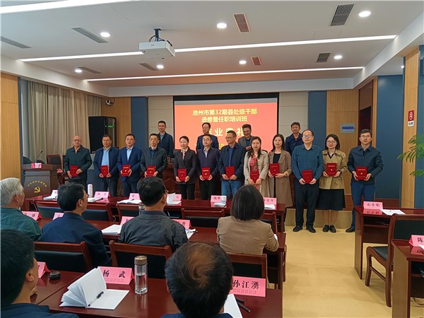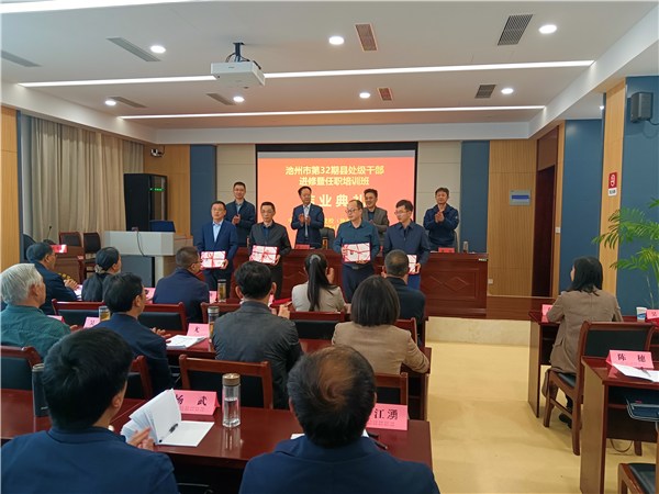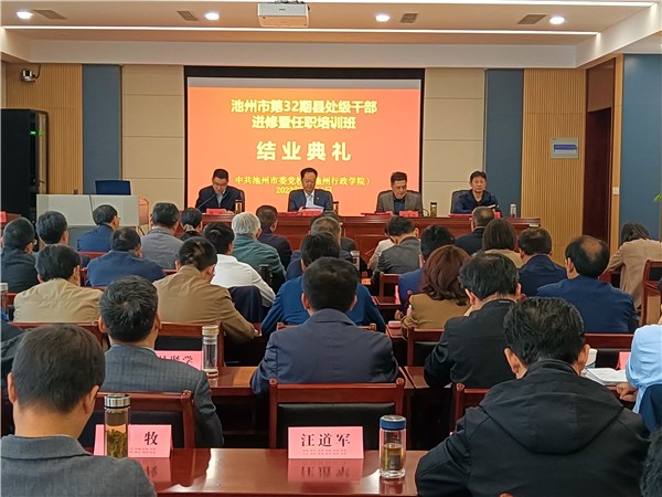 4月14日上午,全市第32期县处级干部进修暨任职培训班结业典礼在市委党校(池州行政学院)举行。常务副校(院)长石兴江作总结讲话,副校(院)长朱春泽、教育长唐维出席。结业典礼由副校(院)长韩辉主持。全市第32期县处级干部进修暨任职培训班全体学员参加典礼。